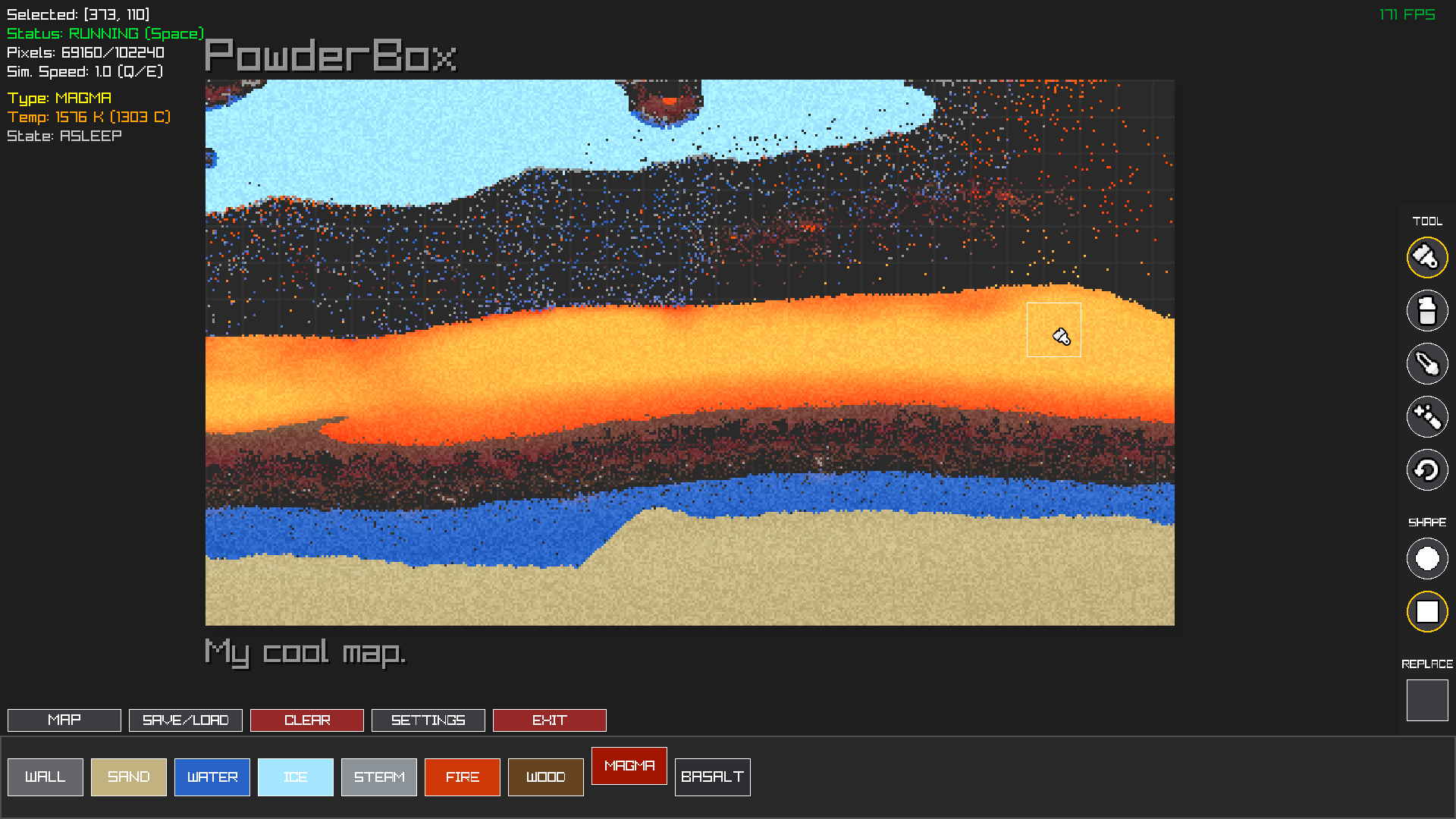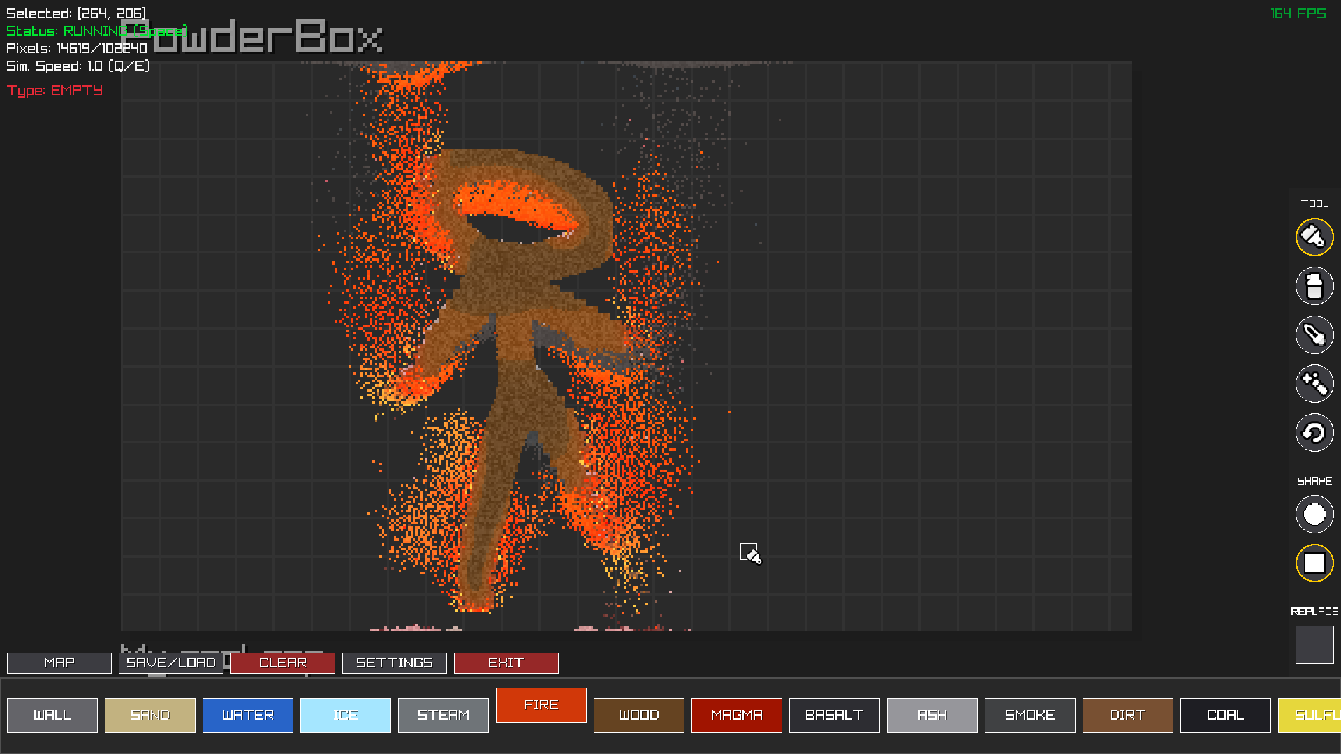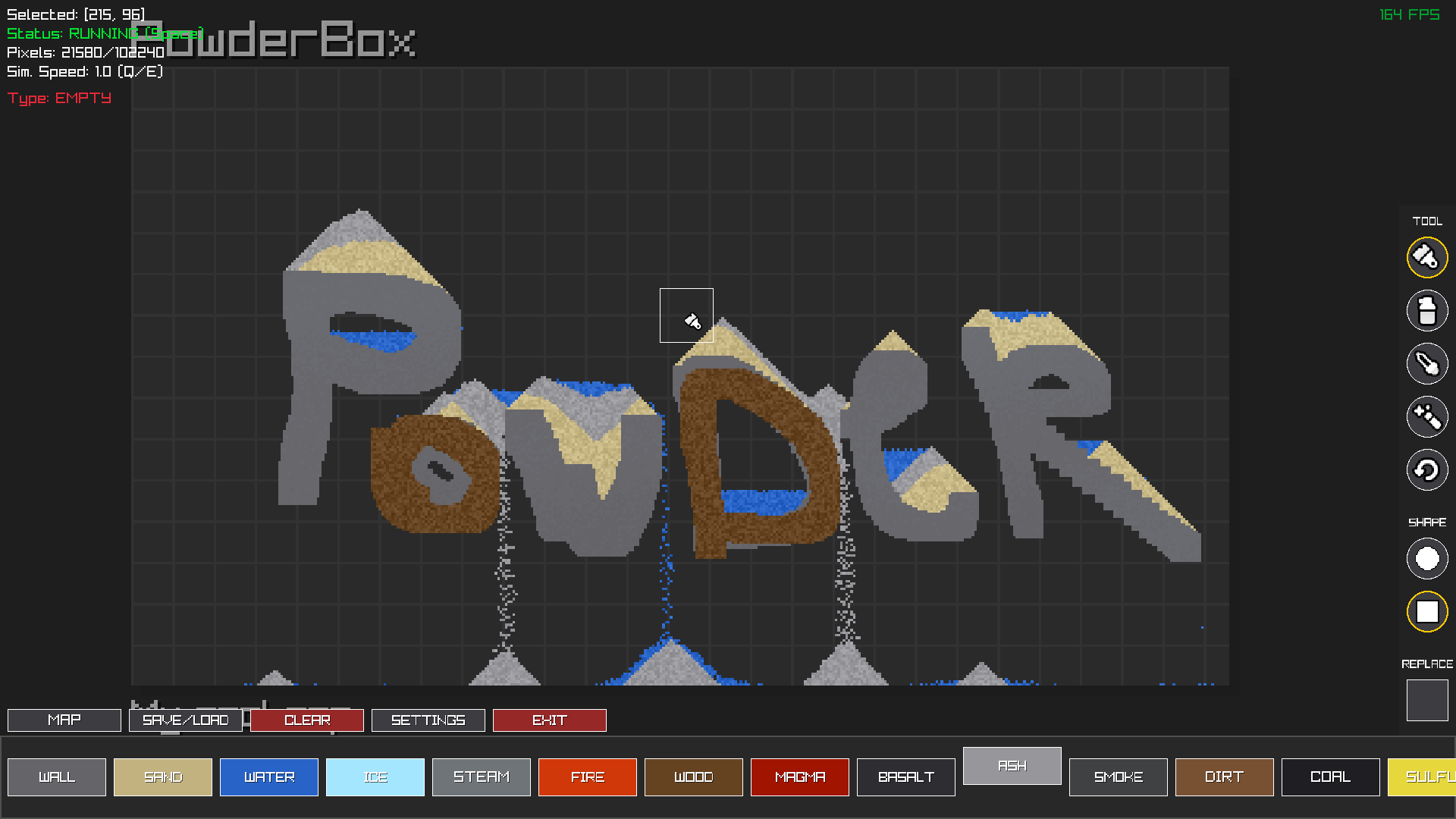 PowderBox is a sandbox simulation where you can experiment with particles like sand, water, fire and other materials.